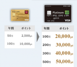エポスカードは、年間100万円程度の利用なので、ポイント還元率でみると、プラチナに変えてもあまりメリットがないです。