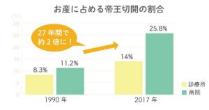 帝王切開で出産する方の比率は増えており、最近のデータを見てみると、割合的には25%で4人に1人です。