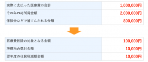 この場合、自己負担で支払った医療費は20万円です。そして医療費控除の金額は10万円ですね。