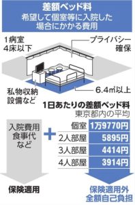 8人部屋くらいまでは健康保険適用範囲内だったりしますが、2〜4人の少人数部屋や個室などは差額ベッド代がかかります。