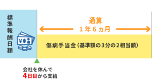 傷病手当金は就業不能状態になった際に、最長で1年6ヶ月間、標準報酬日額の3分の2程度が支給される仕組み。