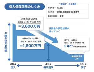 とはいえ収入保障保険は、月10万円でも12ヶ月×30年分だと3600万円になり、それなりに大きな保障が取れます。