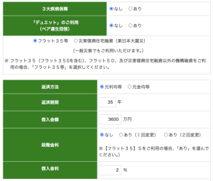 一例として計算してみました。フラット35は以下のような条件で計算しています。条件をなるべく近づけるために三代疾病保障はなしとします。